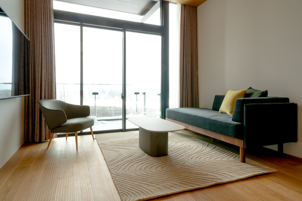 Up to 4 guests, 4 single beds + 1 sofa bed. The most spacious option, with two separate bedrooms, a deep soaking bathtub, a fully equipped kitchen, dedicated living area, and panoramic alpine views.