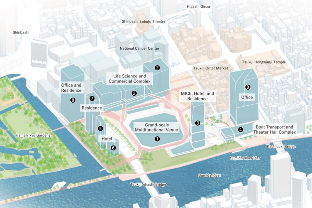 The selected operator group, led by Mitsui Fudosan and including Toyota Fudosan, Yomiuri Shimbun Holdings, and major construction firms Kajima, Shimizu, Taisei, and Takenaka, proposed a total floor area of about 1.17 million square meters across nine buildings. The development calls for around 40% green coverage, with parks and open spaces along the Sumida River waterfront.