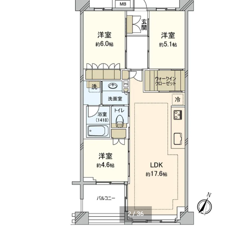 3LDK layout with a large 17.6 m² living-dining area equipped with floor heating