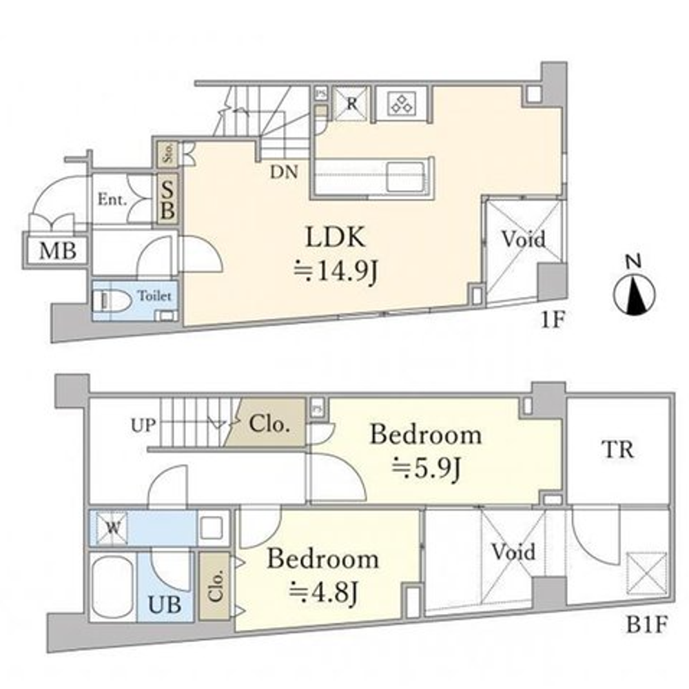 This 63.40 square meter 2LDK unit is designed as a maisonette, creating a split-level layout that provides natural zoning between living and sleeping areas. Being a corner unit, it offers enhanced privacy and light, delivering a sense of openness rare in central Tokyo.