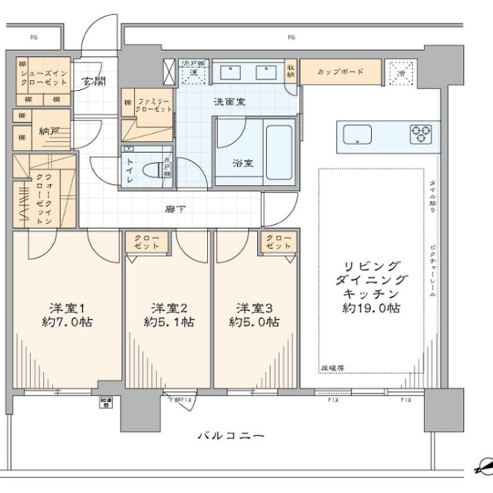 This well-designed 3LDK residence is ideal for families or those seeking extra space in the city. The layout includes a walk-in closet, further closet space, a shoe-in closet, and a storage room, ensuring that every item has its place.