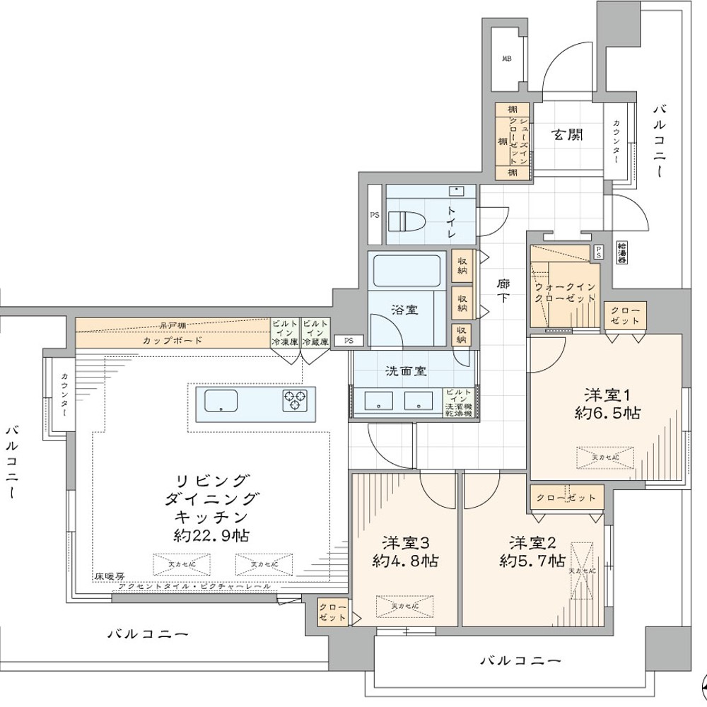 Kitchen, Hot Water, Lighting Fixtures, Flooring, Cooking Stove, Aircon, Open Kitchen, Video Intercom, Toilet, Washlet, Separate Bath Toilet, Shower, Independent Wash Basin, Bathroom Dryer, Storage